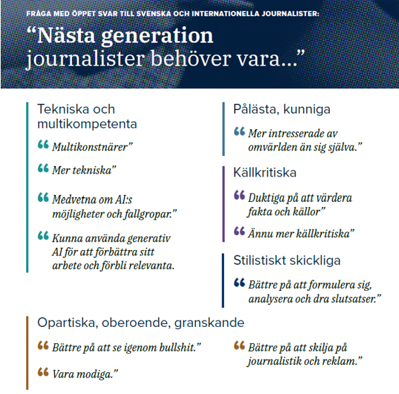 Kommer dessa utmaningar hänga kvar hos framtidens journalister? I rapporten frågade vi hur journalisterna idag anser att framtidens journalister bör vara och utifrån svaren ser det ut som att de här problemen kommer finnas med under en lång tid framöver. Där lyfts även AI in som en viktigt del av framtidens journalistik.